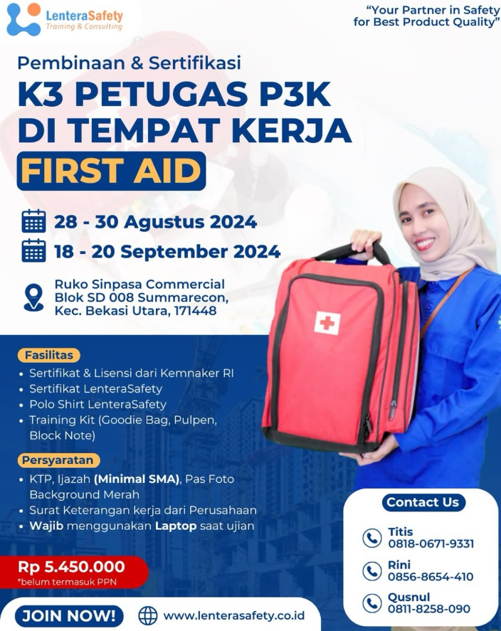 Berkat kerja keras dan dukungan berbagai pihak pada tanggal 13 Mei 2013 mendapatkan surat keputusan penunjukan dari kementrian tenaga kerja dan Transmigrasi Republik Indonesia sebagai Perusahaan Jasa K3.Adapun bidang pelatihan & sertifikasi yang diselenggarakan diantaranya, Sertifikasi Kemnaker RI : • Keahlian K3 Umum & SMK3 • Pesawat Angkat & Pesawat Angkut • Pesawat Uap, Bejana Tekanan & Tangki Timbun • Lingkungan Kerja & Bahan Berbahaya • Bekerja Pada Ketinggian • Kesehatan Kerja • Penanggulangan Kebakaran • Listrik • Pesawat Tenaga & Produksi More InformationTraining akan dibawakan oleh para instruktur yang berpengalaman dan ahli di bidangnya masing-masing, serta memiliki jam terbang mengajar yang cukup.